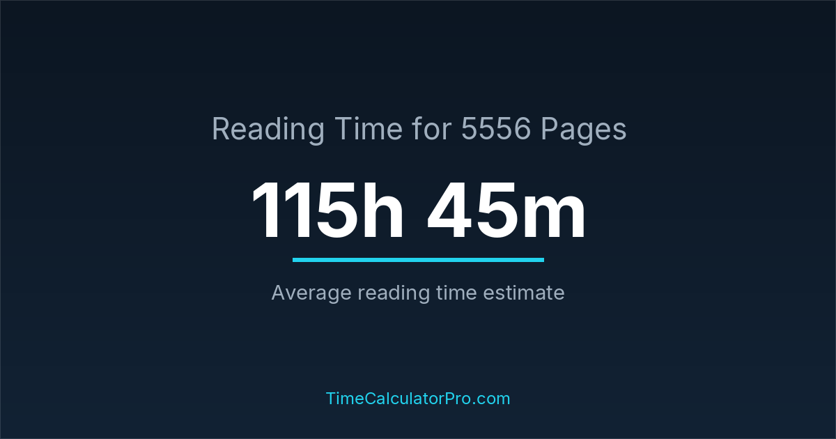 If you read at an average speed of 200 words per minute, reading 5556 pages will take approximately 115 hours and 45 minutes. This estimate assumes around 250 words per page, which is typical for most books.