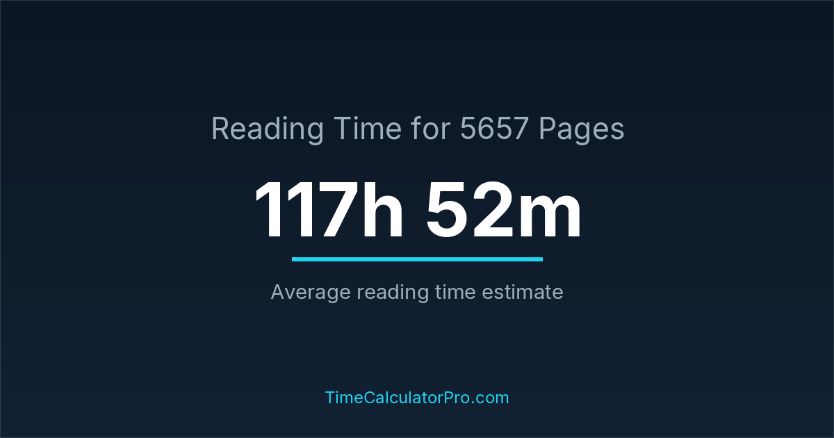 If you read at an average speed of 200 words per minute, reading 5657 pages will take approximately 117 hours and 52 minutes. This estimate assumes around 250 words per page, which is typical for most books.