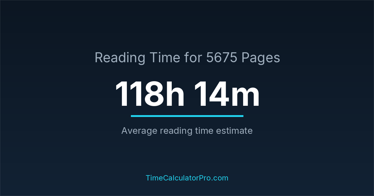 If you read at an average speed of 200 words per minute, reading 5675 pages will take approximately 118 hours and 14 minutes. This estimate assumes around 250 words per page, which is typical for most books.