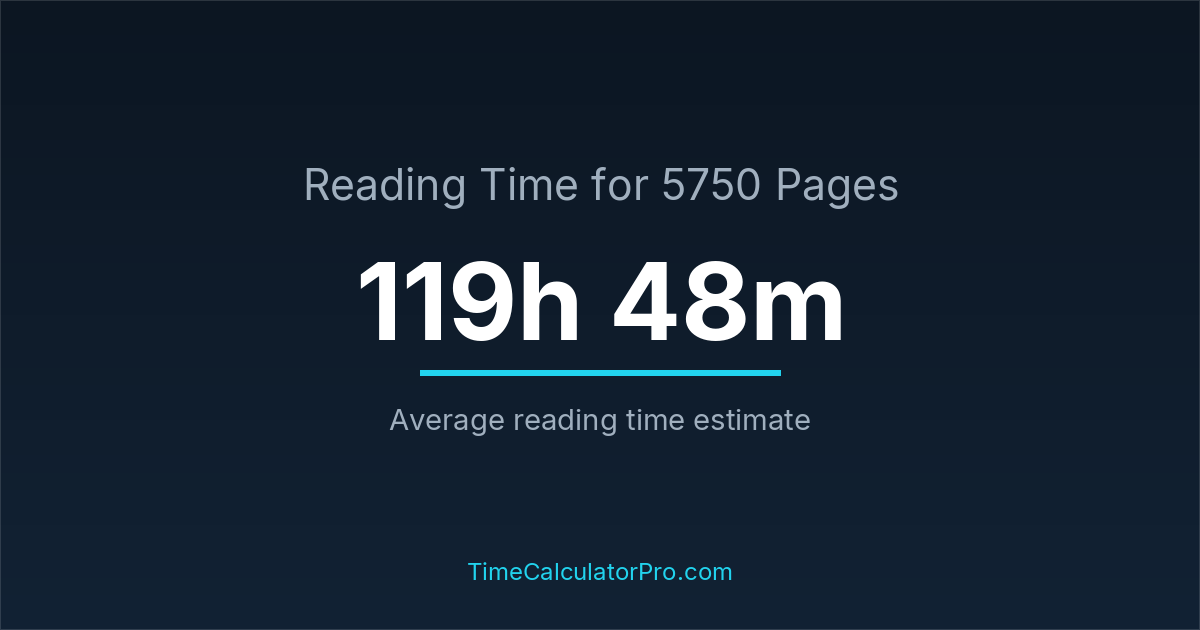 If you read at an average speed of 200 words per minute, reading 5750 pages will take approximately 119 hours and 48 minutes. This estimate assumes around 250 words per page, which is typical for most books.