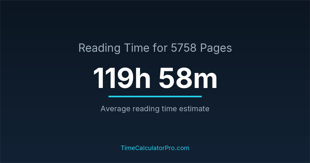 If you read at an average speed of 200 words per minute, reading 5758 pages will take approximately 119 hours and 58 minutes. This estimate assumes around 250 words per page, which is typical for most books.