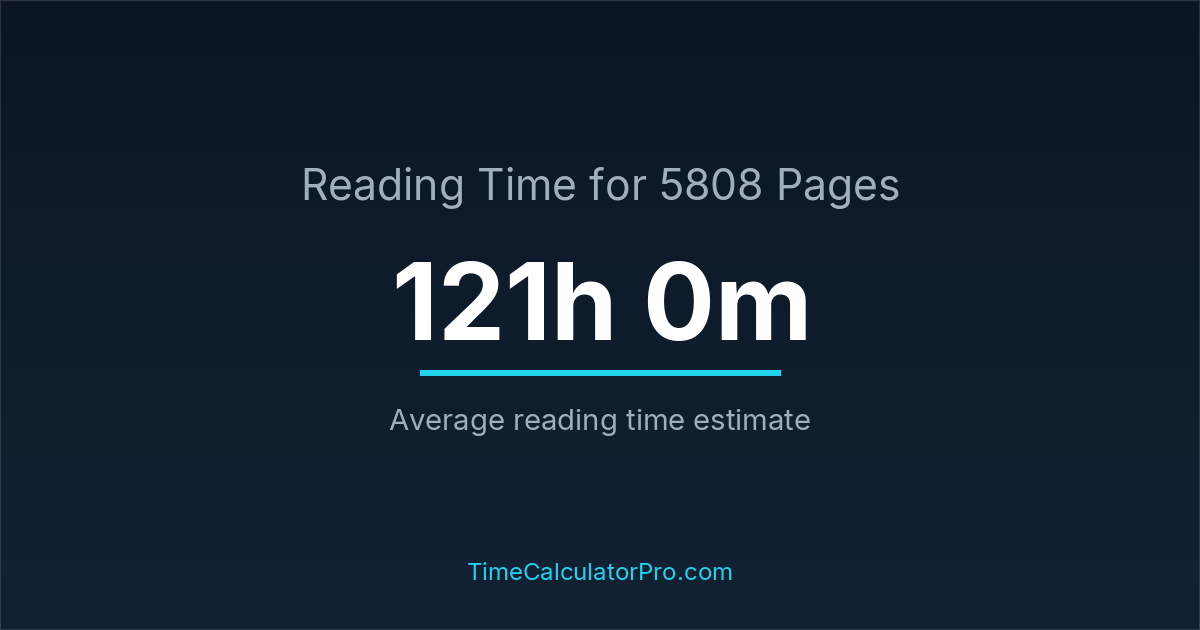If you read at an average speed of 200 words per minute, reading 5808 pages will take approximately 121 hours and 0 minutes. This estimate assumes around 250 words per page, which is typical for most books.