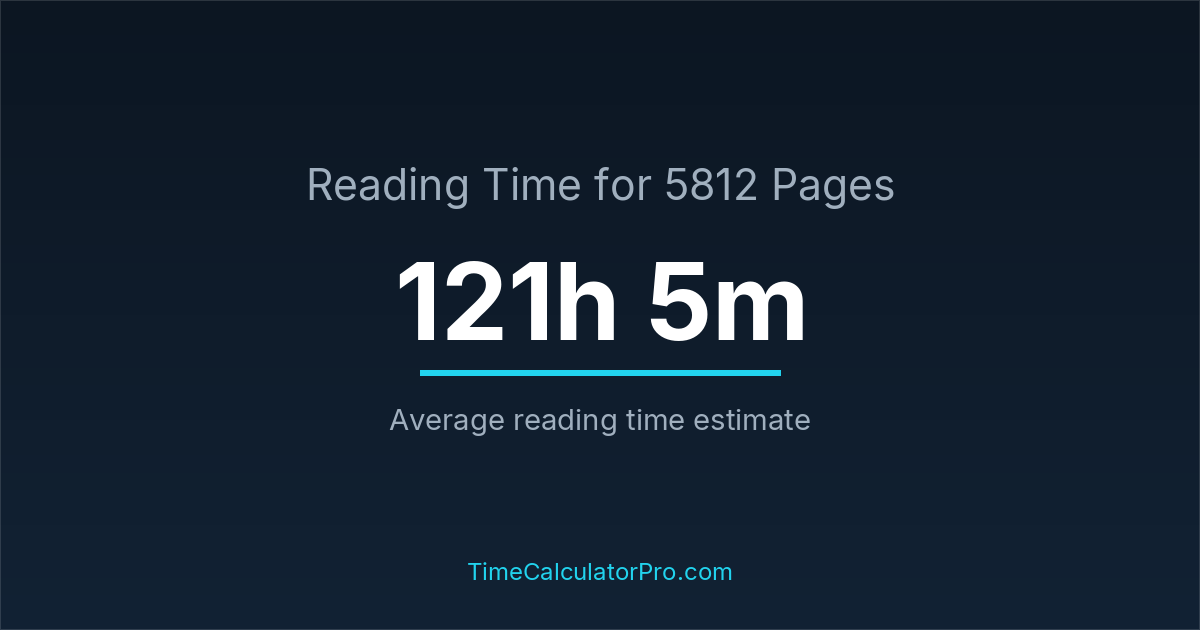 If you read at an average speed of 200 words per minute, reading 5812 pages will take approximately 121 hours and 5 minutes. This estimate assumes around 250 words per page, which is typical for most books.