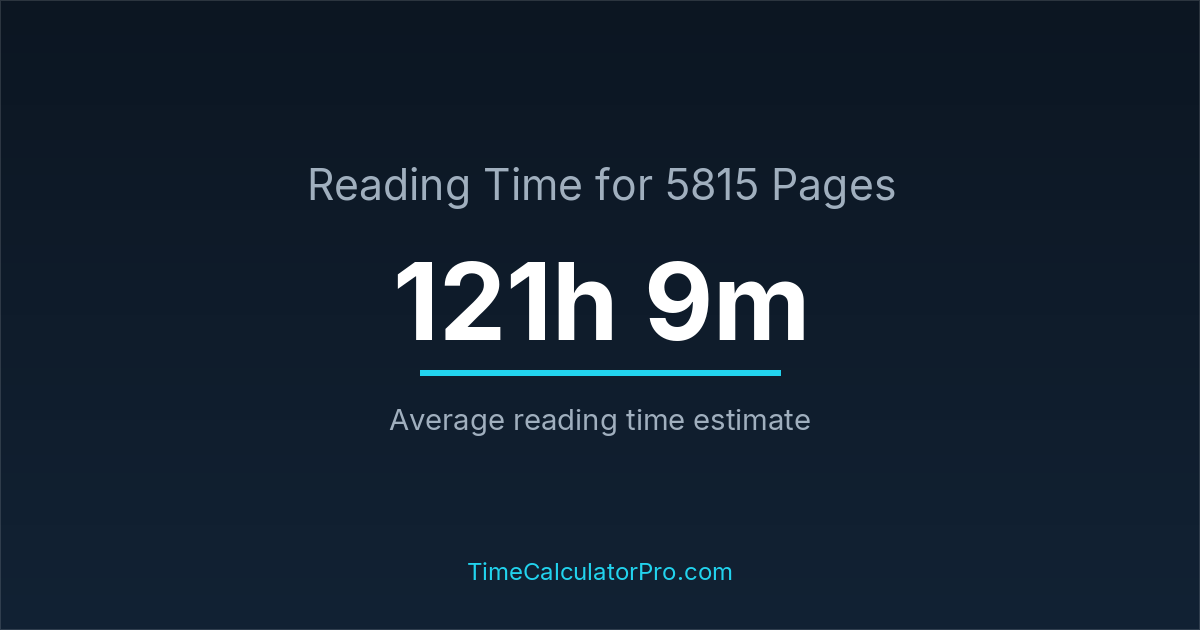 If you read at an average speed of 200 words per minute, reading 5815 pages will take approximately 121 hours and 9 minutes. This estimate assumes around 250 words per page, which is typical for most books.