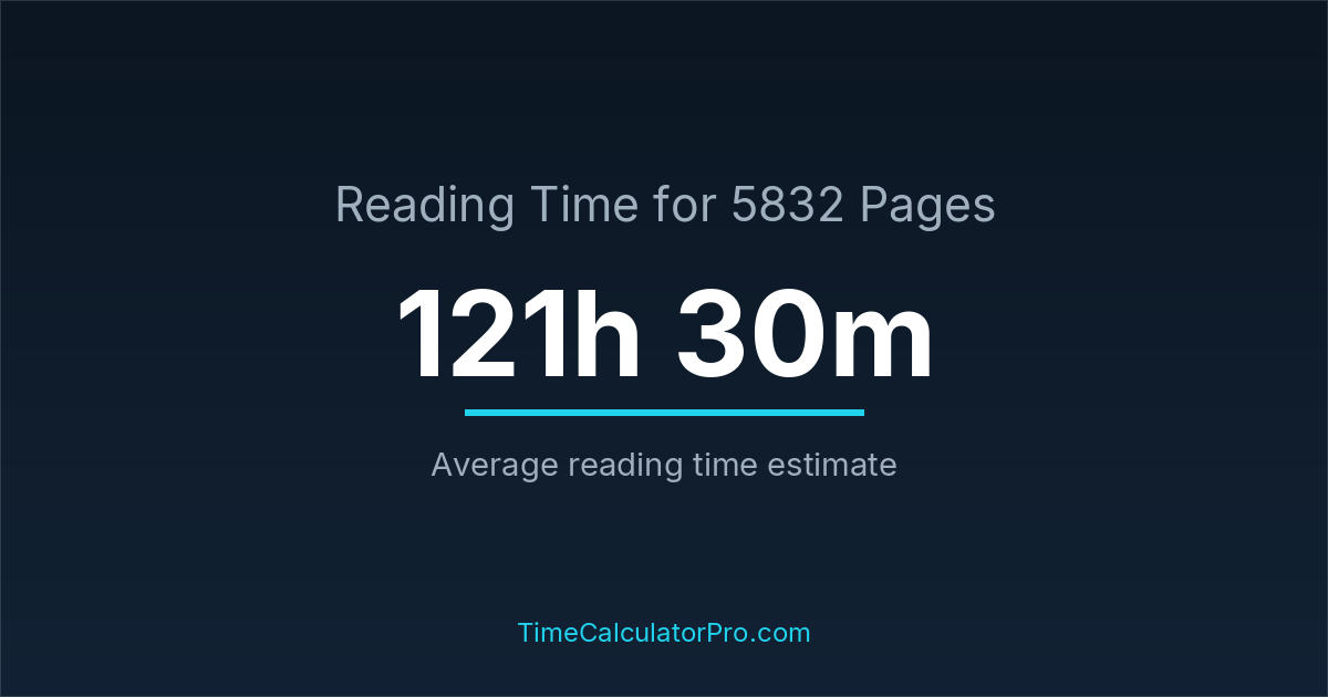 If you are wondering how long it takes to read 5832 pages, the estimated reading time is roughly 121 hours and 30 minutes based on common reading speed averages.