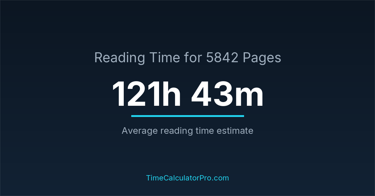 If you read at an average speed of 200 words per minute, reading 5842 pages will take approximately 121 hours and 43 minutes. This estimate assumes around 250 words per page, which is typical for most books.