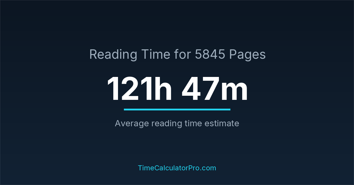 If you read at an average speed of 200 words per minute, reading 5845 pages will take approximately 121 hours and 47 minutes. This estimate assumes around 250 words per page, which is typical for most books.