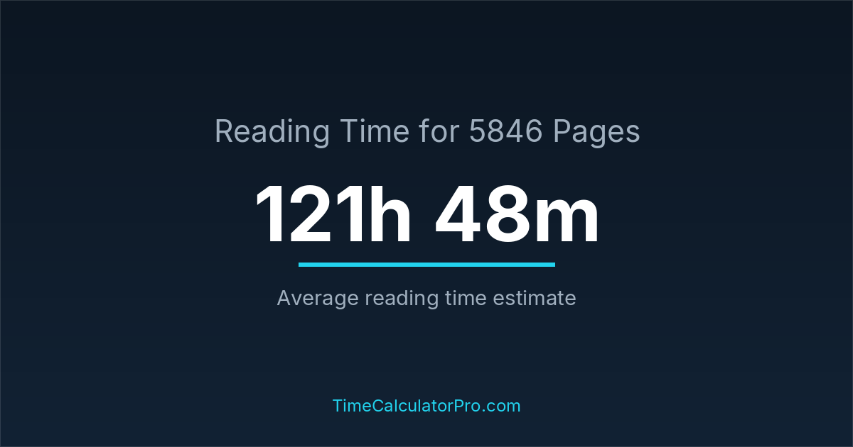 If you read at an average speed of 200 words per minute, reading 5846 pages will take approximately 121 hours and 48 minutes. This estimate assumes around 250 words per page, which is typical for most books.