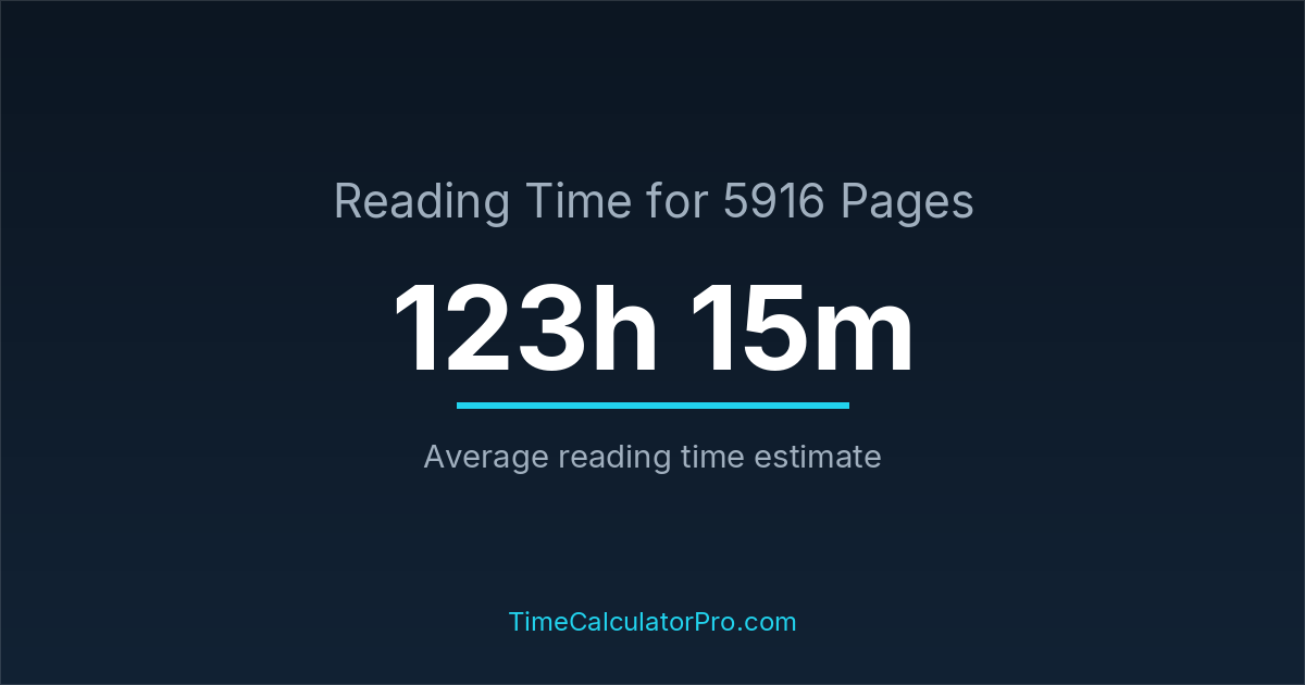 If you read at an average speed of 200 words per minute, reading 5916 pages will take approximately 123 hours and 15 minutes. This estimate assumes around 250 words per page, which is typical for most books.