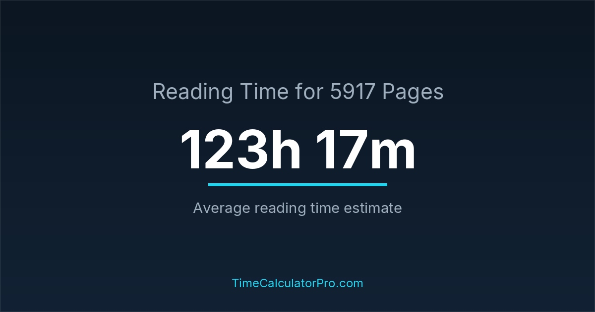 If you read at an average speed of 200 words per minute, reading 5917 pages will take approximately 123 hours and 17 minutes. This estimate assumes around 250 words per page, which is typical for most books.