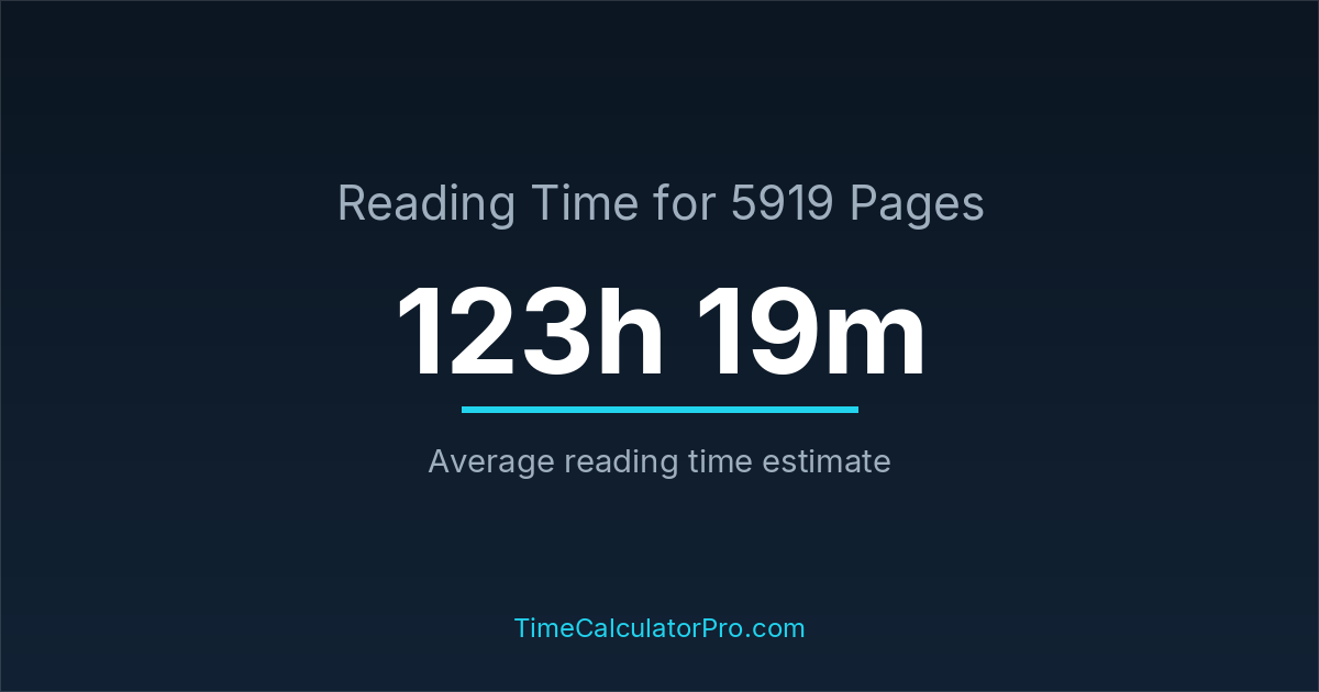 If you read at an average speed of 200 words per minute, reading 5919 pages will take approximately 123 hours and 19 minutes. This estimate assumes around 250 words per page, which is typical for most books.