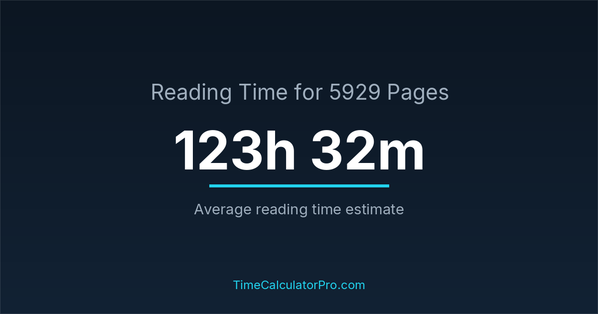If you read at an average speed of 200 words per minute, reading 5929 pages will take approximately 123 hours and 32 minutes. This estimate assumes around 250 words per page, which is typical for most books.