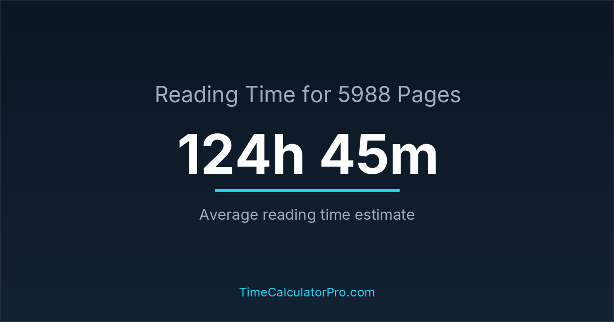 If you read at an average speed of 200 words per minute, reading 5988 pages will take approximately 124 hours and 45 minutes. This estimate assumes around 250 words per page, which is typical for most books.