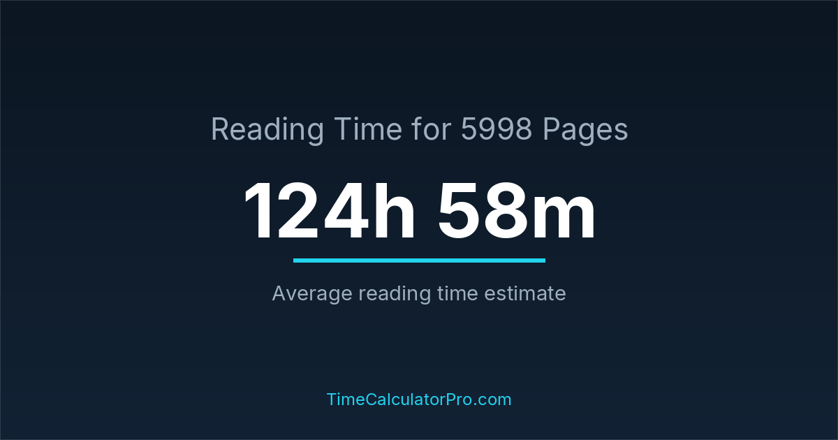 If you read at an average speed of 200 words per minute, reading 5998 pages will take approximately 124 hours and 58 minutes. This estimate assumes around 250 words per page, which is typical for most books.
