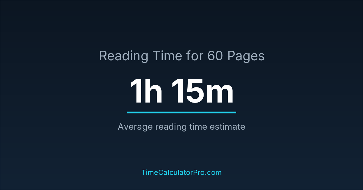 If you read at an average speed of 200 words per minute, reading 60 pages will take approximately 1 hours and 15 minutes. This estimate assumes around 250 words per page, which is typical for most books.