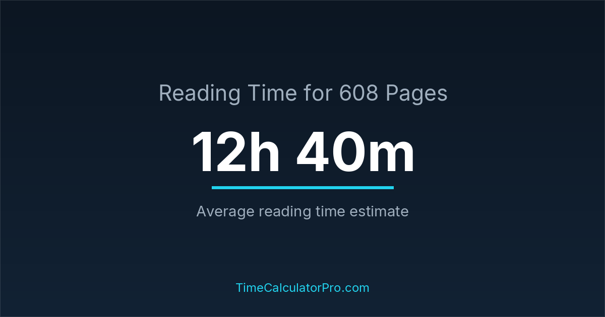 Using a reading time calculator, you can estimate that 608 pages will take around 12 hours and 40 minutes to complete.