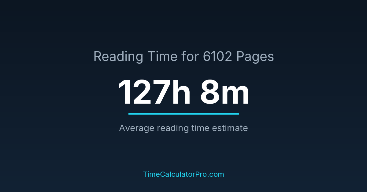 If you read at an average speed of 200 words per minute, reading 6102 pages will take approximately 127 hours and 8 minutes. This estimate assumes around 250 words per page, which is typical for most books.