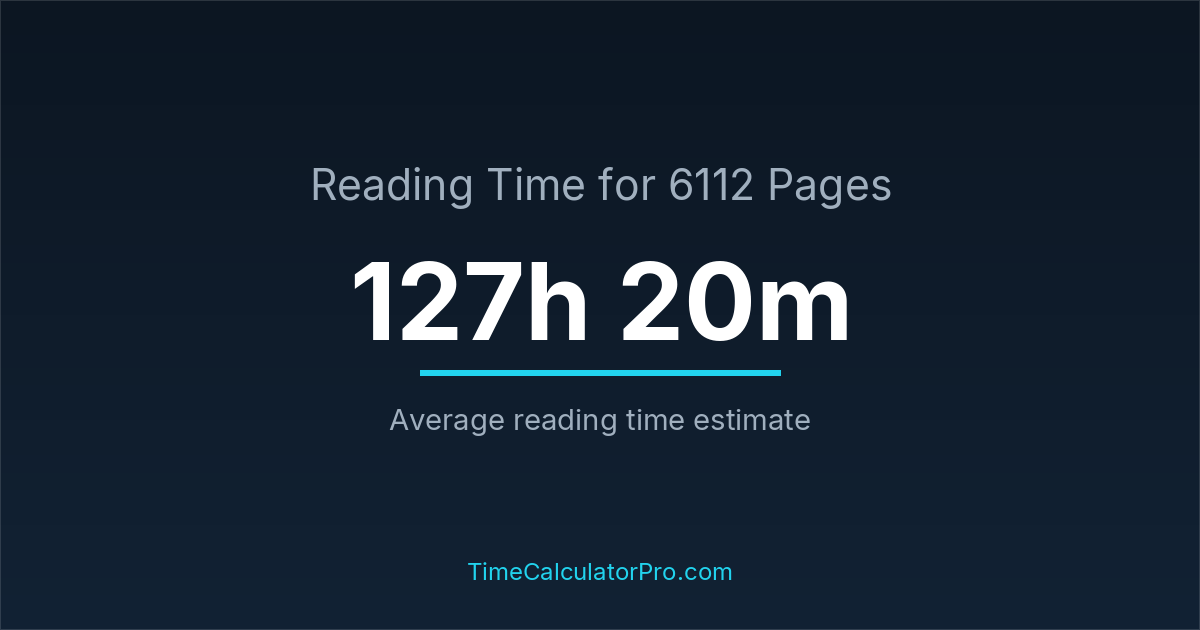 If you read at an average speed of 200 words per minute, reading 6112 pages will take approximately 127 hours and 20 minutes. This estimate assumes around 250 words per page, which is typical for most books.
