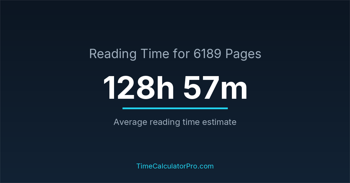 If you read at an average speed of 200 words per minute, reading 6189 pages will take approximately 128 hours and 57 minutes. This estimate assumes around 250 words per page, which is typical for most books.