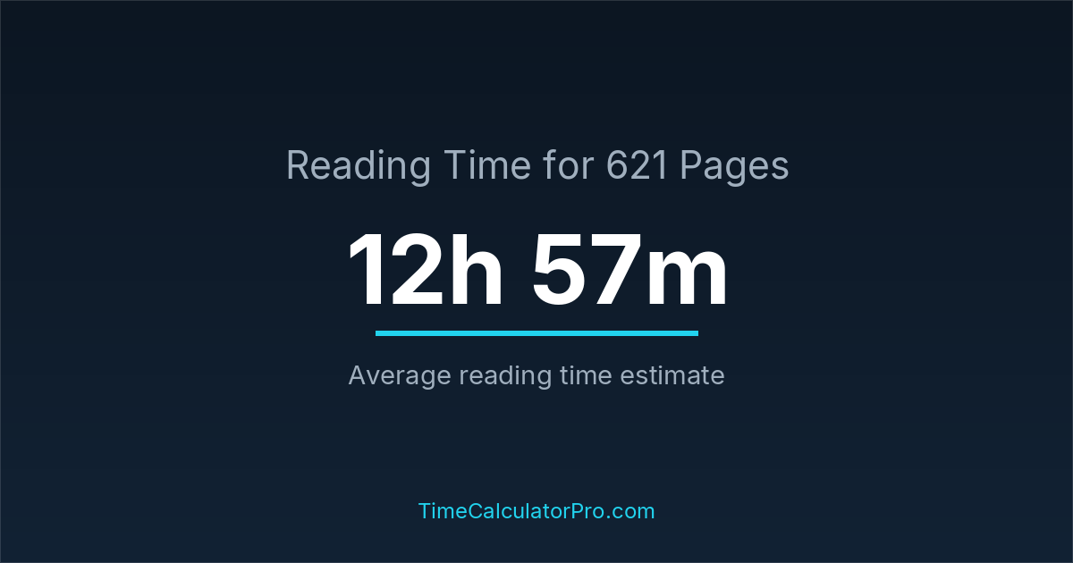 Using a reading time calculator, you can estimate that 621 pages will take around 12 hours and 57 minutes to complete.