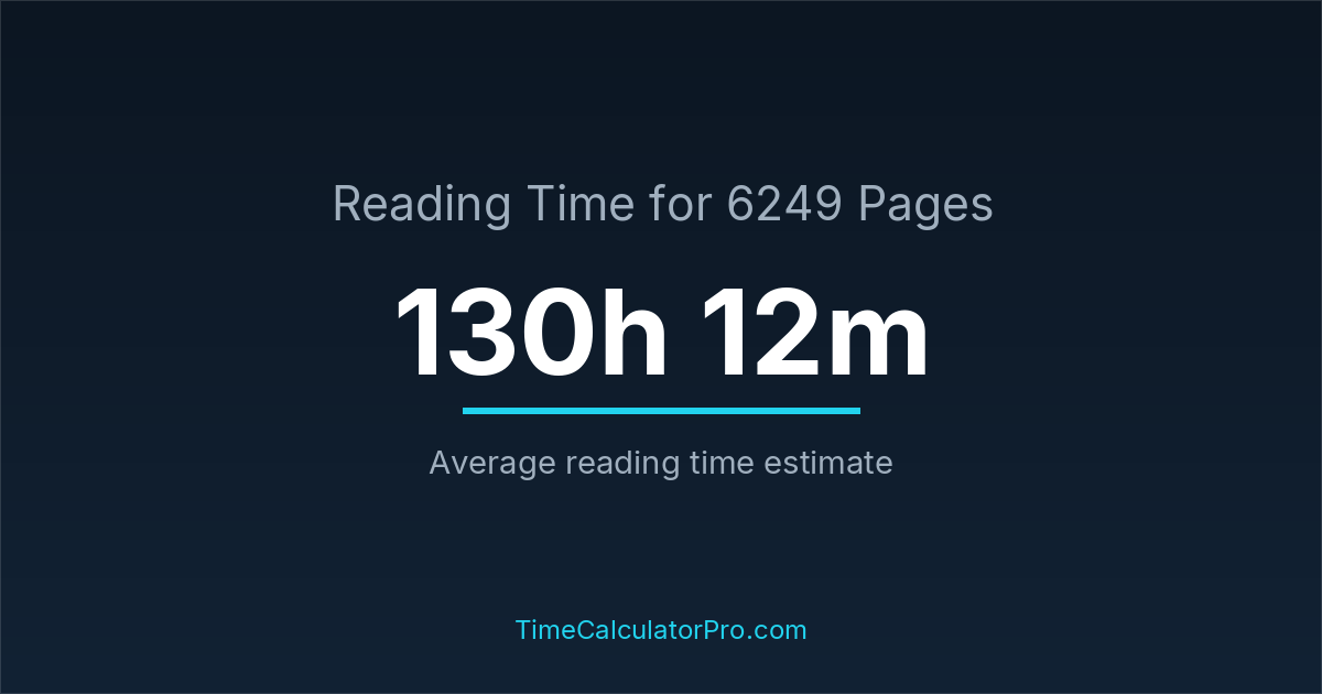 If you read at an average speed of 200 words per minute, reading 6249 pages will take approximately 130 hours and 12 minutes. This estimate assumes around 250 words per page, which is typical for most books.