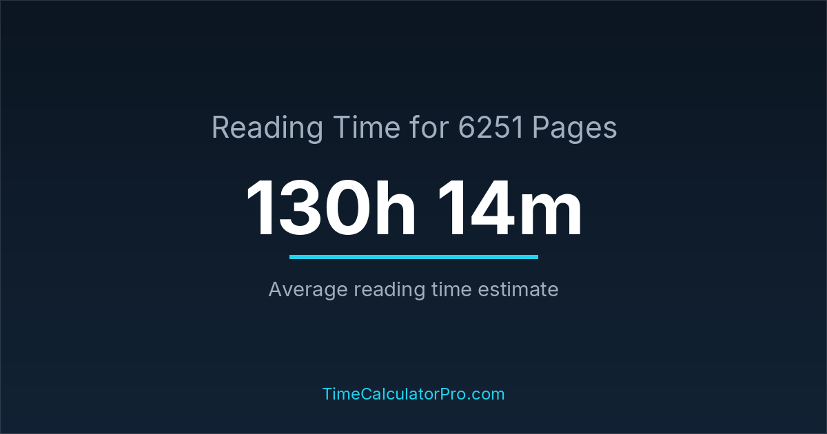 If you read at an average speed of 200 words per minute, reading 6251 pages will take approximately 130 hours and 14 minutes. This estimate assumes around 250 words per page, which is typical for most books.