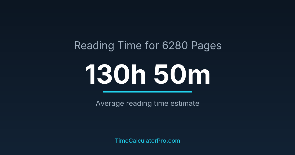 On average, reading 6280 pages may require about 130 hours and 50 minutes for most readers, assuming a standard reading pace and moderate difficulty.