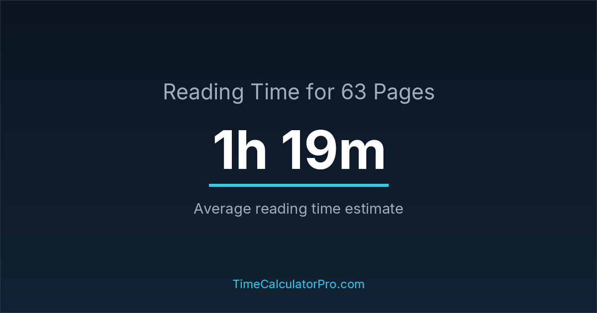 If you read at an average speed of 200 words per minute, reading 63 pages will take approximately 1 hours and 19 minutes. This estimate assumes around 250 words per page, which is typical for most books.