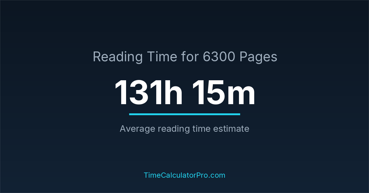 If you read at an average speed of 200 words per minute, reading 6300 pages will take approximately 131 hours and 15 minutes. This estimate assumes around 250 words per page, which is typical for most books.