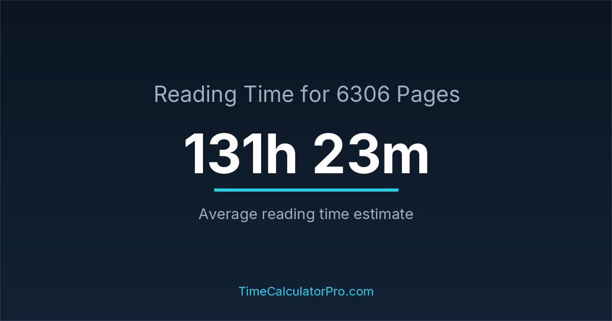 If you read at an average speed of 200 words per minute, reading 6306 pages will take approximately 131 hours and 23 minutes. This estimate assumes around 250 words per page, which is typical for most books.