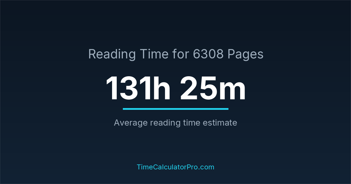 If you read at an average speed of 200 words per minute, reading 6308 pages will take approximately 131 hours and 25 minutes. This estimate assumes around 250 words per page, which is typical for most books.