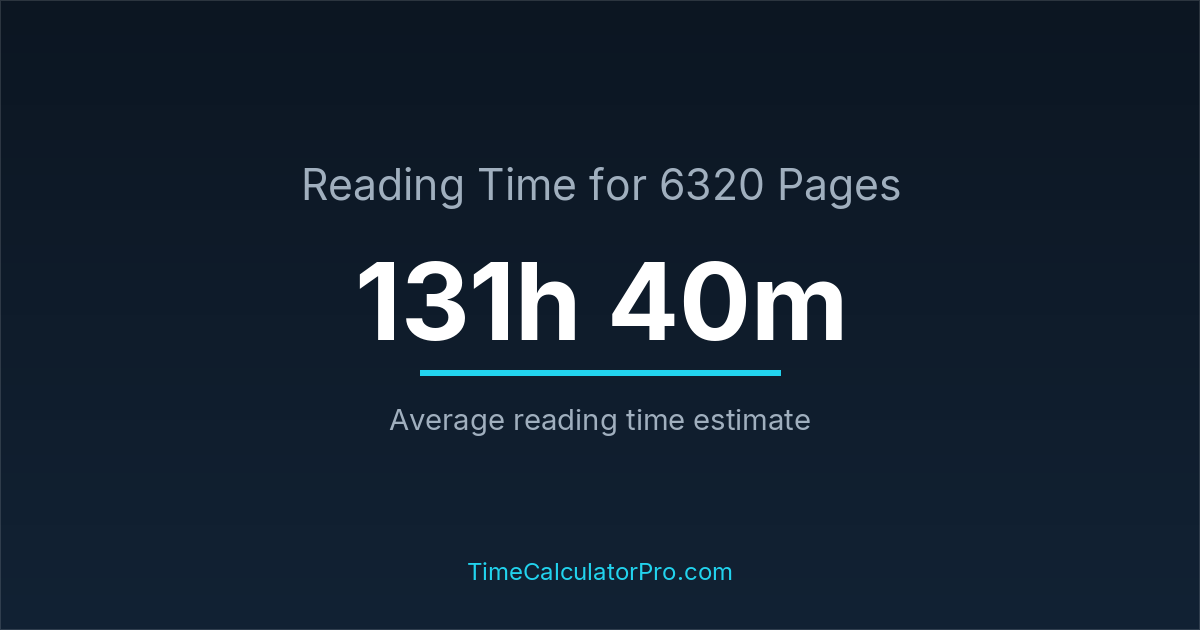 If you read at an average speed of 200 words per minute, reading 6320 pages will take approximately 131 hours and 40 minutes. This estimate assumes around 250 words per page, which is typical for most books.