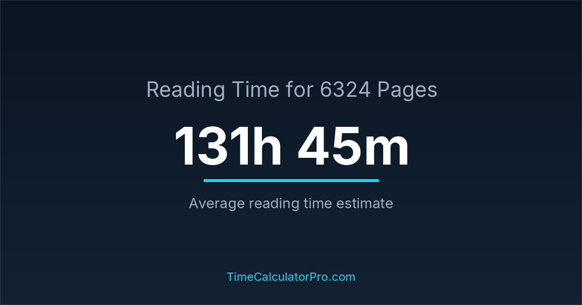 If you read at an average speed of 200 words per minute, reading 6324 pages will take approximately 131 hours and 45 minutes. This estimate assumes around 250 words per page, which is typical for most books.
