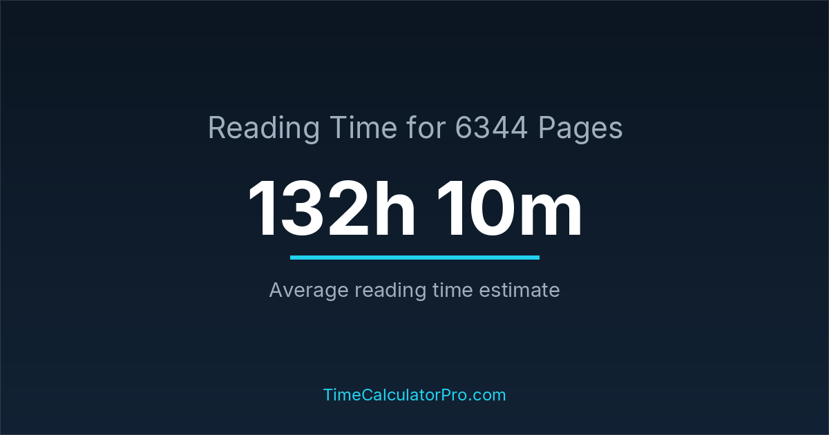 It typically takes around 132 hours and 10 minutes to read 6344 pages depending on your reading speed, focus level, and the complexity of the material.