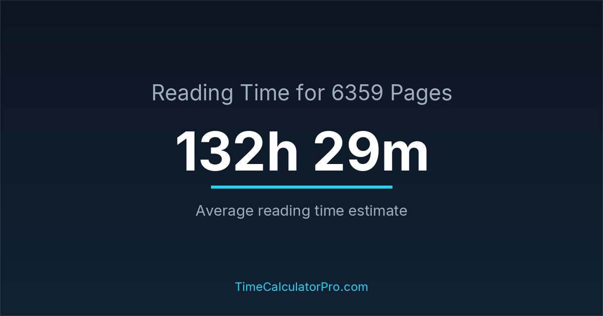 If you read at an average speed of 200 words per minute, reading 6359 pages will take approximately 132 hours and 29 minutes. This estimate assumes around 250 words per page, which is typical for most books.