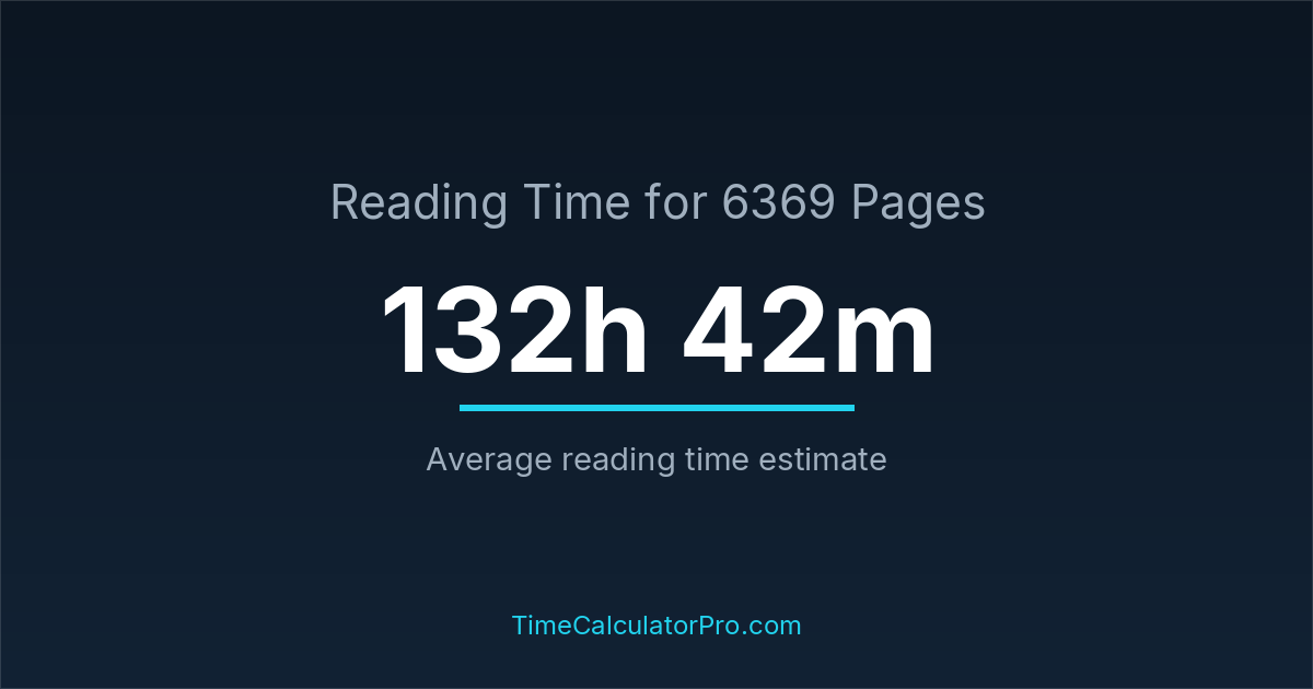If you read at an average speed of 200 words per minute, reading 6369 pages will take approximately 132 hours and 42 minutes. This estimate assumes around 250 words per page, which is typical for most books.