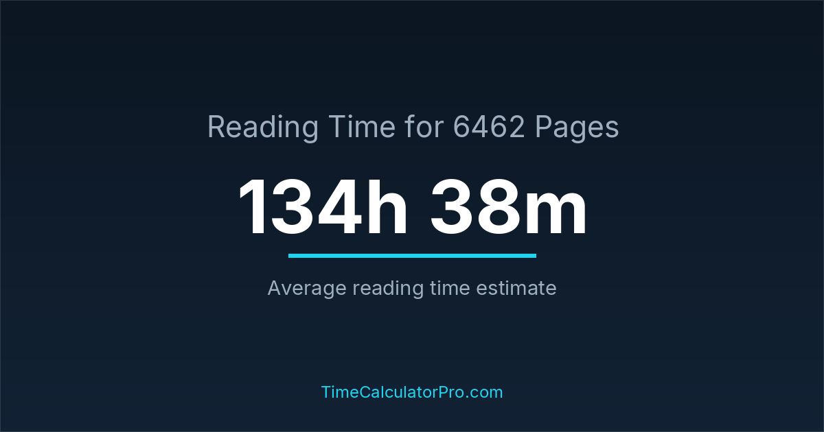 If you read at an average speed of 200 words per minute, reading 6462 pages will take approximately 134 hours and 38 minutes. This estimate assumes around 250 words per page, which is typical for most books.