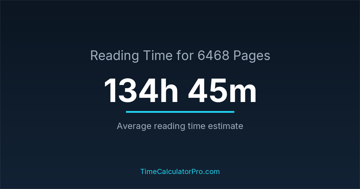 If you read at an average speed of 200 words per minute, reading 6468 pages will take approximately 134 hours and 45 minutes. This estimate assumes around 250 words per page, which is typical for most books.