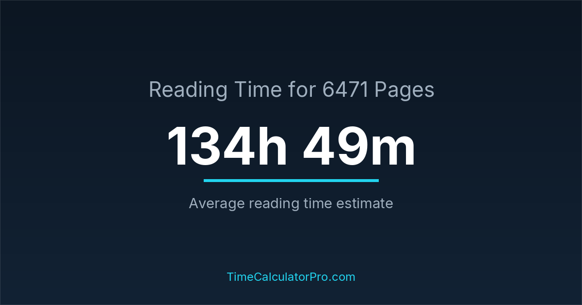 If you read at an average speed of 200 words per minute, reading 6471 pages will take approximately 134 hours and 49 minutes. This estimate assumes around 250 words per page, which is typical for most books.