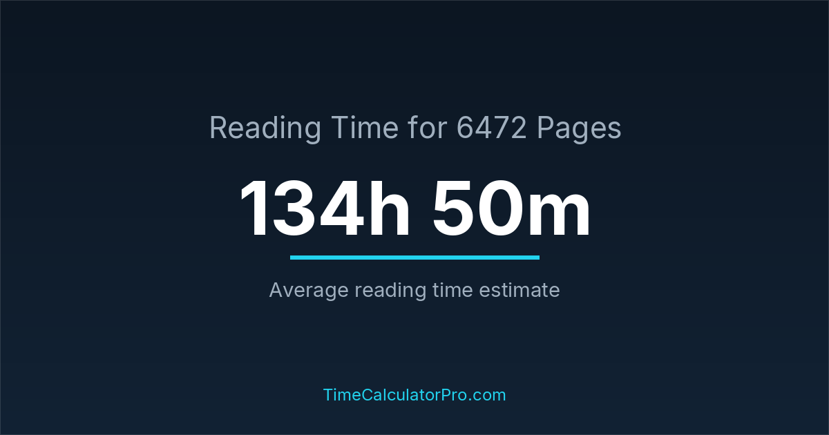 If you read at an average speed of 200 words per minute, reading 6472 pages will take approximately 134 hours and 50 minutes. This estimate assumes around 250 words per page, which is typical for most books.
