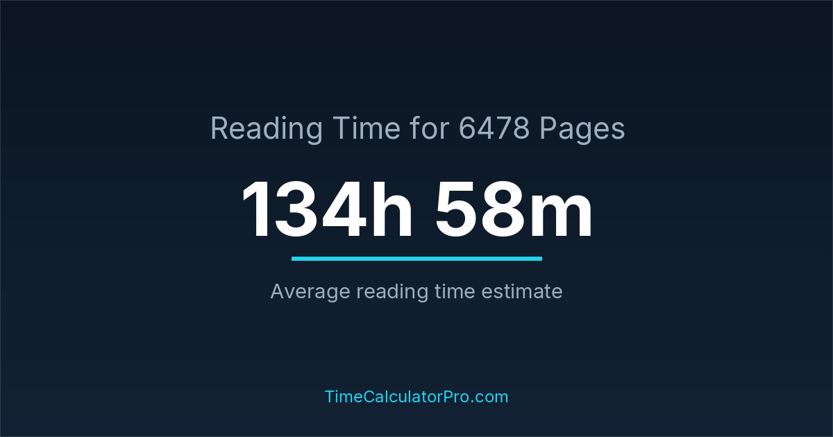If you read at an average speed of 200 words per minute, reading 6478 pages will take approximately 134 hours and 58 minutes. This estimate assumes around 250 words per page, which is typical for most books.