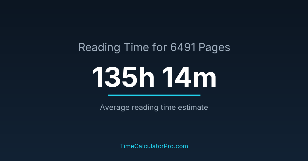 If you read at an average speed of 200 words per minute, reading 6491 pages will take approximately 135 hours and 14 minutes. This estimate assumes around 250 words per page, which is typical for most books.