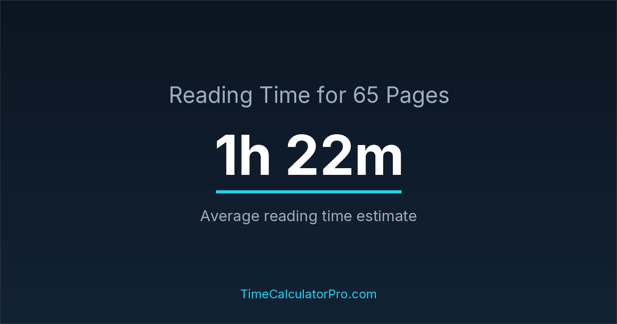 If you read at an average speed of 200 words per minute, reading 65 pages will take approximately 1 hours and 22 minutes. This estimate assumes around 250 words per page, which is typical for most books.