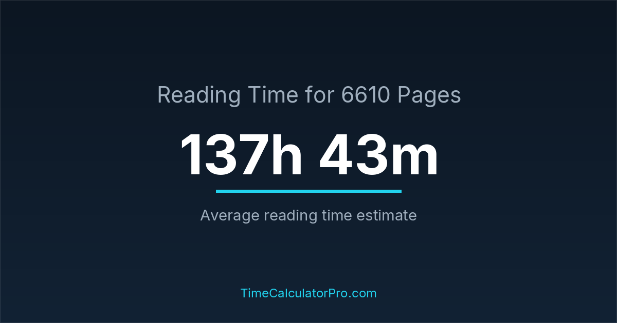 If you read at an average speed of 200 words per minute, reading 6610 pages will take approximately 137 hours and 43 minutes. This estimate assumes around 250 words per page, which is typical for most books.