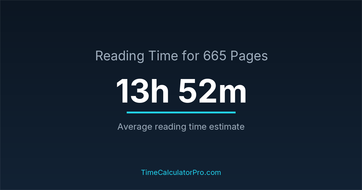 Using a reading time calculator, you can estimate that 665 pages will take around 13 hours and 52 minutes to complete.