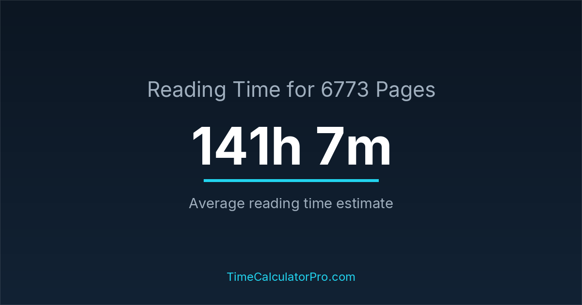 If you read at an average speed of 200 words per minute, reading 6773 pages will take approximately 141 hours and 7 minutes. This estimate assumes around 250 words per page, which is typical for most books.