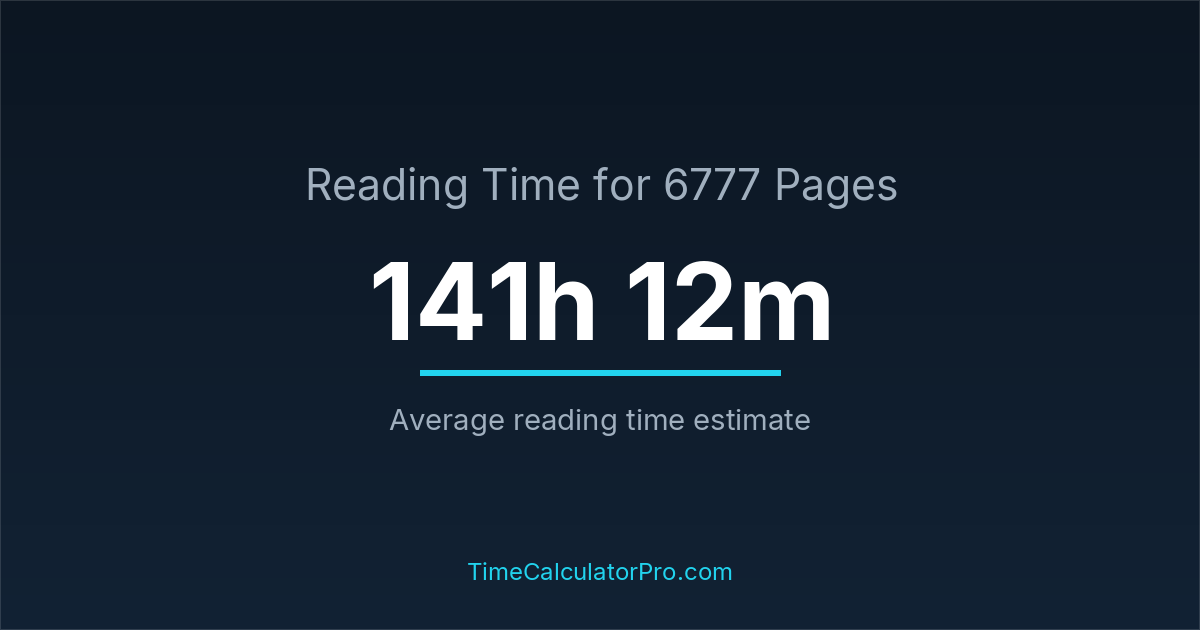 If you read at an average speed of 200 words per minute, reading 6777 pages will take approximately 141 hours and 12 minutes. This estimate assumes around 250 words per page, which is typical for most books.