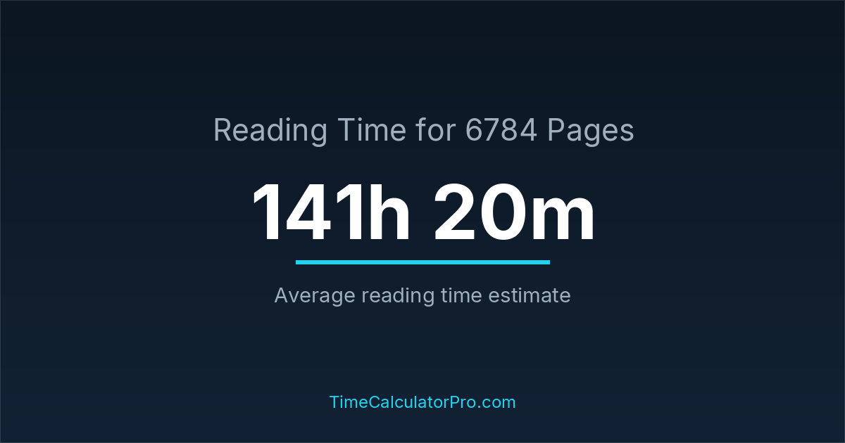 If you read at an average speed of 200 words per minute, reading 6784 pages will take approximately 141 hours and 20 minutes. This estimate assumes around 250 words per page, which is typical for most books.