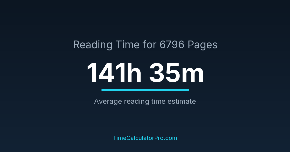 If you read at an average speed of 200 words per minute, reading 6796 pages will take approximately 141 hours and 35 minutes. This estimate assumes around 250 words per page, which is typical for most books.