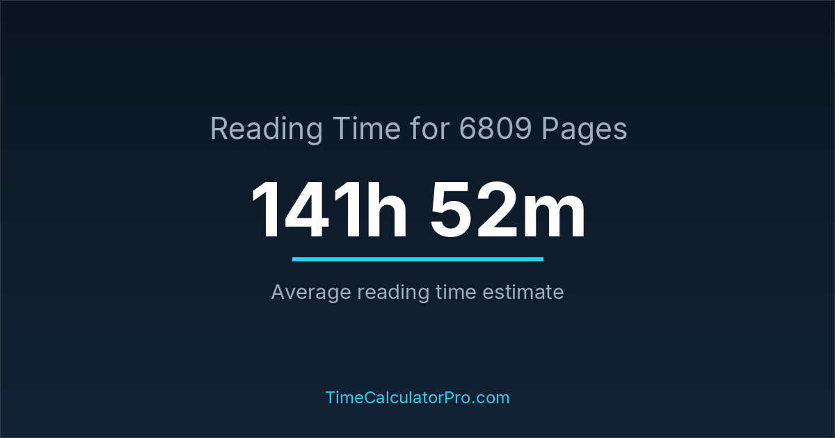 If you read at an average speed of 200 words per minute, reading 6809 pages will take approximately 141 hours and 52 minutes. This estimate assumes around 250 words per page, which is typical for most books.
